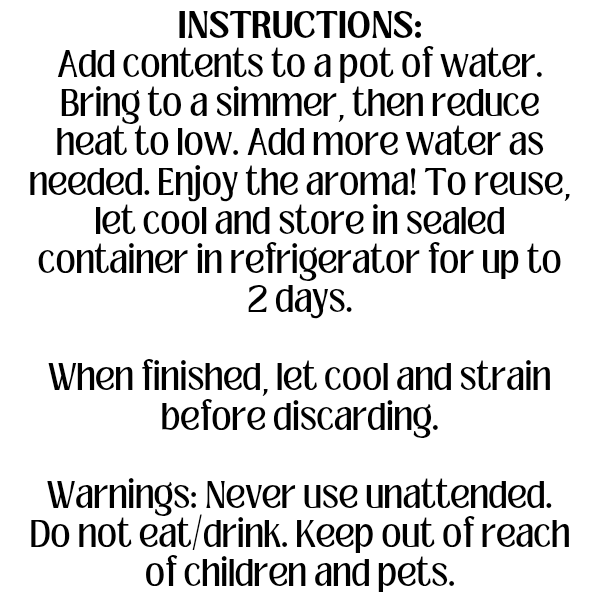 Simply pour contents into a small pot or slow cooker, add water, and simmer on low. Refill water as needed and enjoy hours of natural, non-toxic fragrance filling your home.